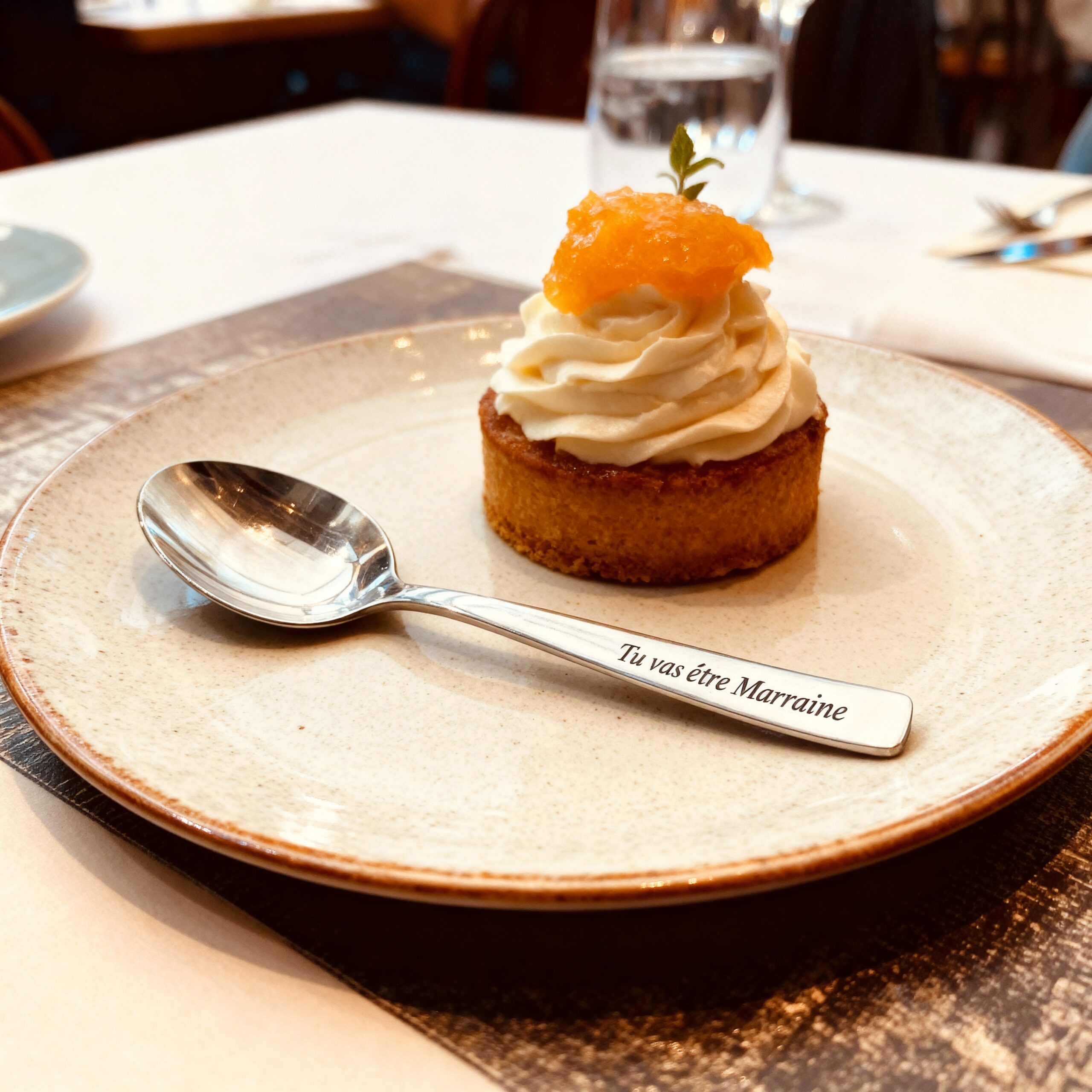 « Conviez la future marraine au restaurant. Arrivez un peu en avance et demandez au serveur de glisser la cuillère dans son assiette au moment du dessert. Effet de surprise garanti ! Pour une version discrète (car croyez-moi, une demande peut provoquer des réactions pas toujours très contenues …), ça marche aussi chez vous !! Annoncer la bonne nouvelle de cette manière restera un moment inoubliable dont elle pourra garder un souvenir ! »